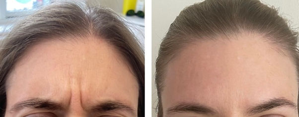 Bekymringrynken og panderynker er behandlet med botox- læg mærke til løftet af brynene.
